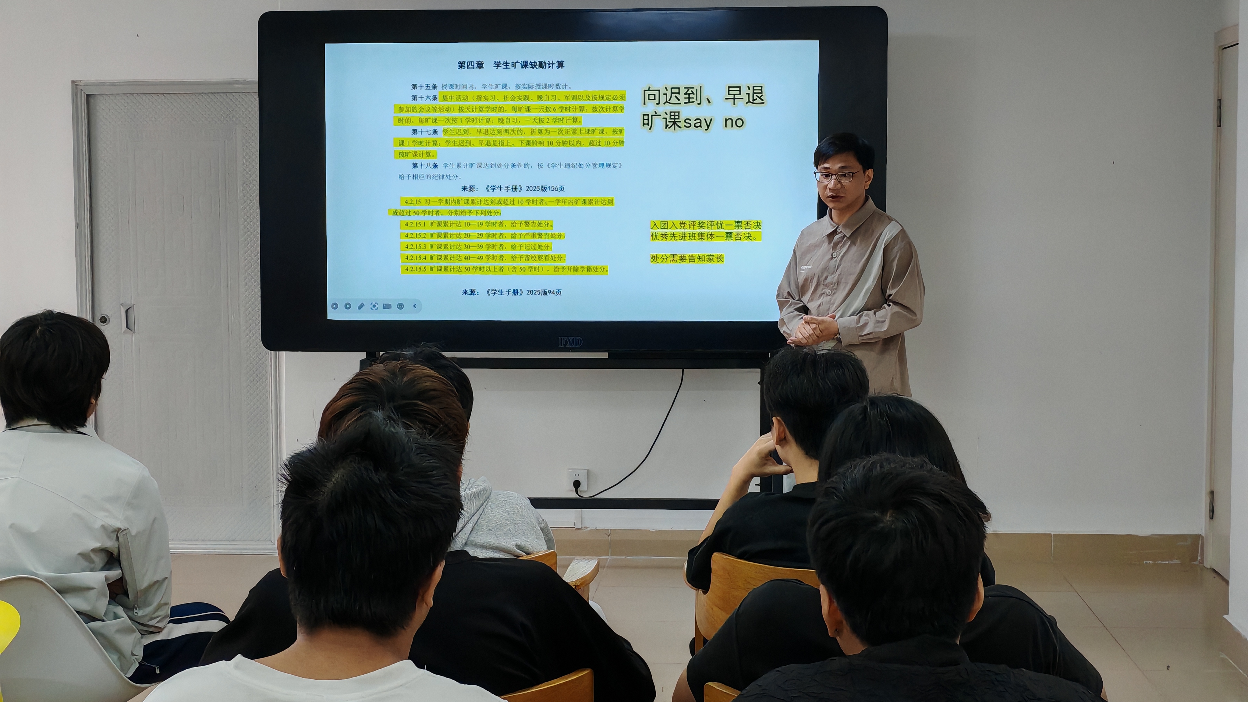 会上,辅导员老师肯定了学院整体学风向好的态势,同时提醒同学们临近期末需保持专注,科学规划学习与生活。明确以“提醒帮助为主、过程引导为重”的缺勤处理机制,通过班委与班主任、辅导员联动关注、及时沟通。对因学业适应、时间管理等原因缺勤的学生,开展谈心谈话与学业帮扶,引导其回归课堂、踏实求学。老师们还鼓励同学们积极反馈学习困难,强调学风建设需师生协同、久久为功。
