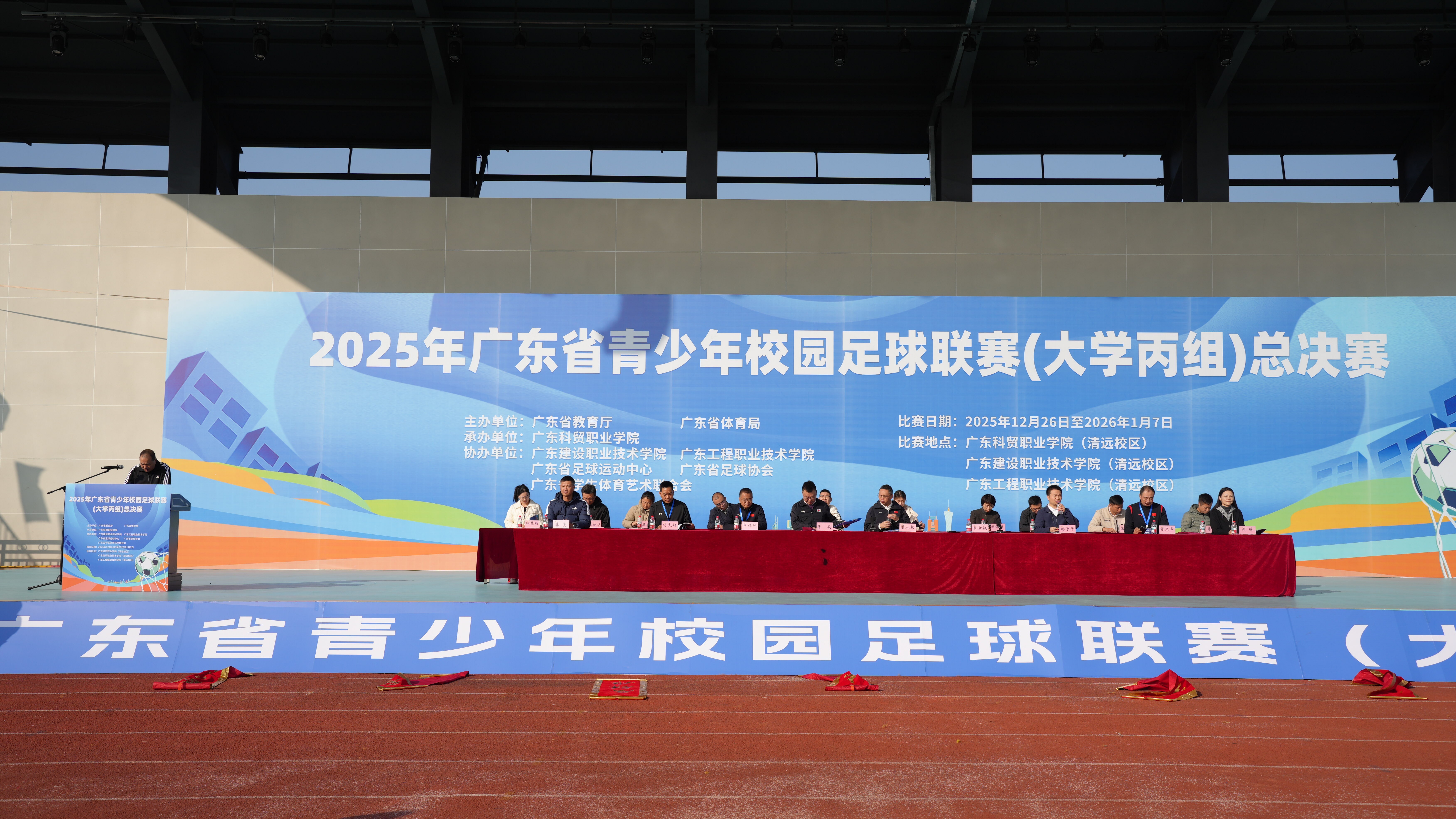 2025年12月26日至2026年1月7日,由广东省教育厅与广东省体育局联合主办、广东科贸职业学院承办,广东建设职业技术学院及广东工程职业技术学院共同协办的2025年广东省青少年校园足球联赛(大学丙组)总决赛将于我校举行。此次协办赛事为我校提供了展示体育赛事组织能力、推动校园体育文化建设的重要平台。