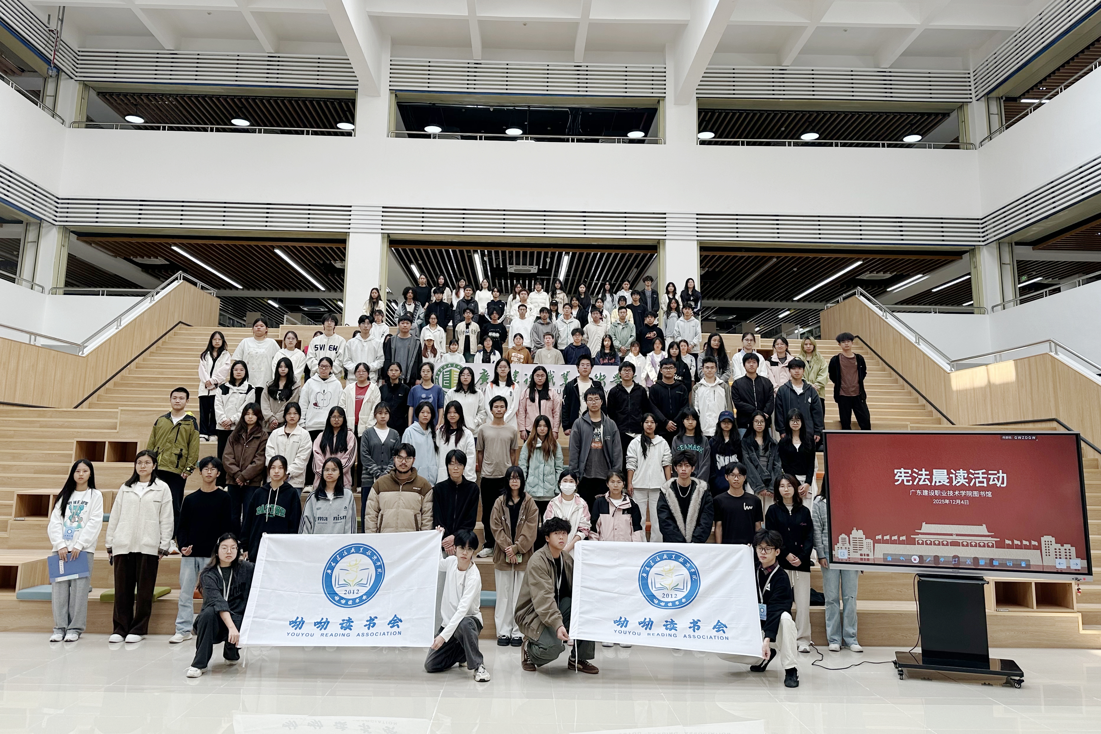 活动期间,学校统筹部署、全域联动,构建“线上 + 线下”“集中 + 自主”的宪法学习体系。12 月 4 日国家宪法日当天,学校设立清远校区分会场,学校党委副书记方秀英带领在清二级学院负责人及学生代表等220多名师生集中参与教育部“宪法晨读” 直播活动,同步跟读宪法条款,感受宪法庄严。各部门、二级学院广泛发动无课师生通过教育部全国青少年普法网收看直播,实现师生学习宪法全覆盖。