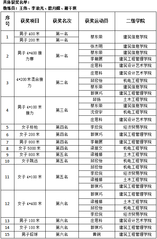 我校田径队由公共课教学部主任赖锦松担任领队,王伟、李浪光、詹月嫦、谢干琪四位老师组成教练团队,率领13名精锐队员出征。赛场上,我校健儿们凭借顽强拼搏的意志和卓越的发挥屡创佳绩,斩获15项大奖,并在男子200米、400米、4×400米接力三个项目中强势夺冠。最终,我校以112分的优异成绩,荣膺丙A组团体总分一等奖!