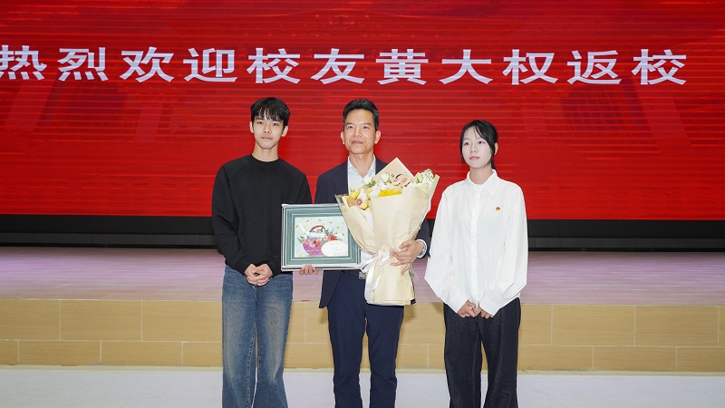 在随后的主题分享中,黄大权校友结合自身从学子到企业家的成长与创业历程,围绕个人经历、学习方法、职业规划及处世智慧等方面展开讲述。他通过企业发展实例,介绍了工程管理数字化、人工智能应用等行业前沿实践,为在场师生带来了一场紧扣时代、启迪思维的精彩讲座。互动环节,学生代表向校友赠送礼物并献花,表达对学长的敬意。