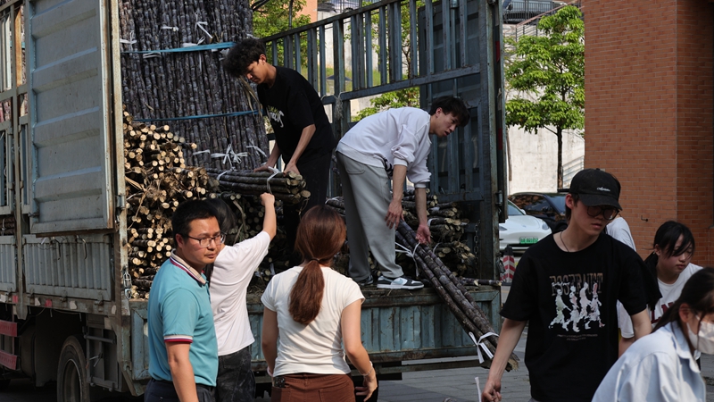 学生志愿者邓随缘一边把甘蔗派发给学生们,一边说:“这是我第二次参加这样的行动,让我感受到农民的不容易,能为乡村振兴贡献出自己的青春力量,很有意义。”