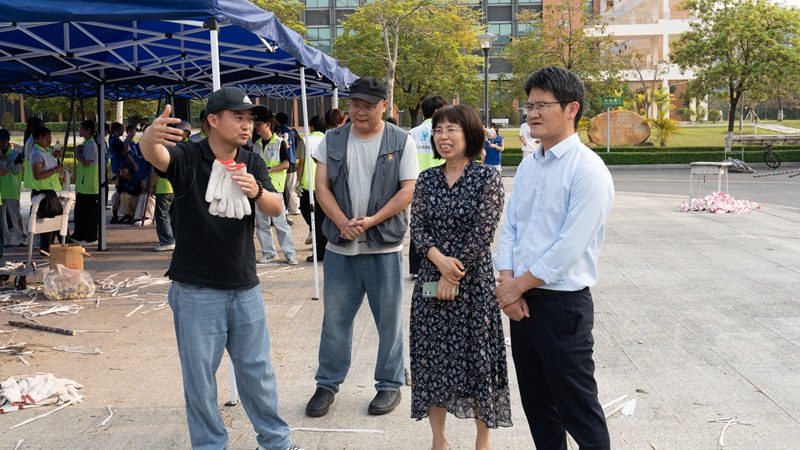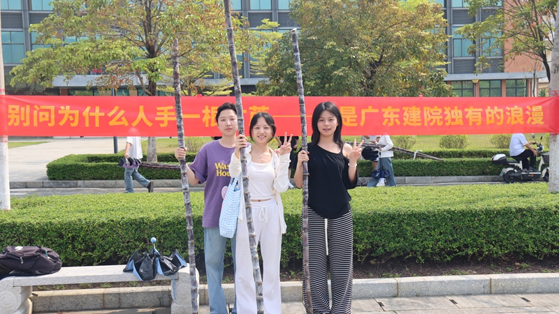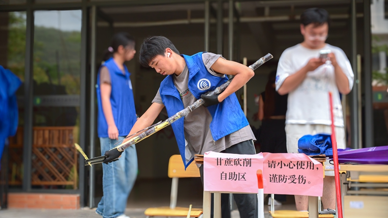 活动现场热闹有序,成为校园里最动人的风景。清远校区鲁班广场、广州校区综合楼前篮球场上,成捆的甘蔗整齐堆放。300多名工作人员和志愿者负责甘蔗搬运、分发、登记、砍削和秩序维护等工作,他们忙碌穿梭,有序引导师生领取。弯腰搬蔗的脊背汗水浸透了衣衫、沾着糖霜的指尖、被甘蔗叶划出细痕却笑意不减……就连负责为甘蔗削皮的学生,动作也快速娴熟起来。