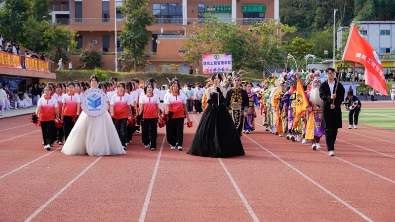 开幕式在激昂的节奏中拉开帷幕。国旗、校旗、裁判员方阵、教工方阵以及各二级学院学生代表方阵依次入场,他们步伐整齐、精神抖擞,有的喊出嘹亮口号,有的展现特色队形,有的摆起美妙造型,有的跳起英歌舞,有的展现专业特长,传统文化、现代艺术、民族文化、学科文化交融其中,青春气息扑面而来。