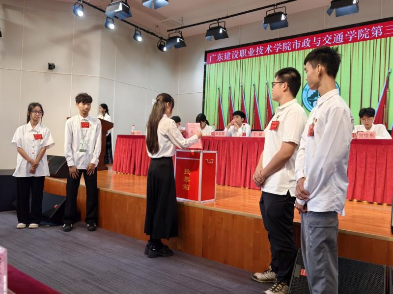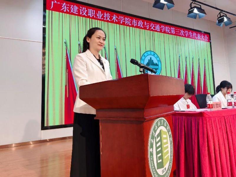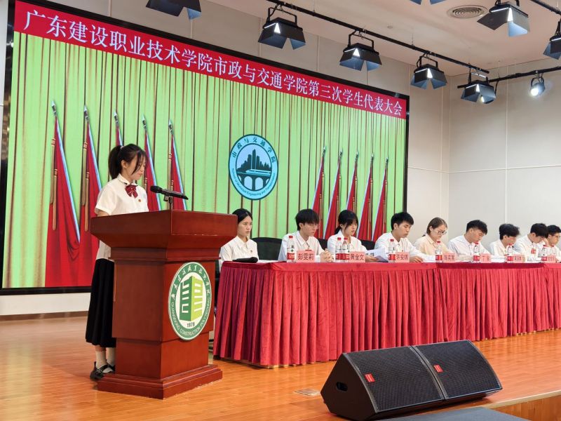 市政与交通学院第二届学生会主席团成员陈奕蒿代表第二届学生会作题为《凝聚青春力量,服务学生成长,助力梦想起航》的工作报告,市政与交通学院第二届学生会委员会委员卢子贤作《关于〈广东建设职业技术学院市政与交通学院学生会章程(2024年修正案)〉修订的说明》。