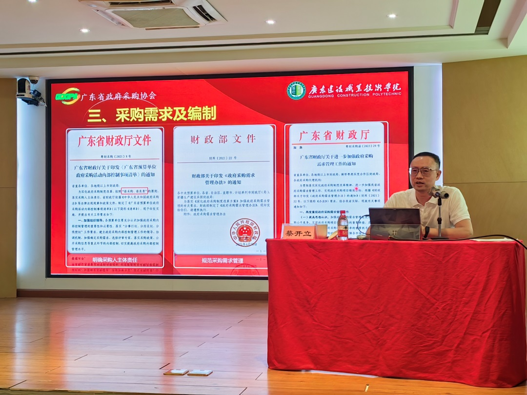 会上,蔡开立围绕财政部《政府采购需求管理办法》、《广东省财政厅关于进一步加强政府采购需求管理工作的通知》以及相关法规政策,从政府采购及单位内控执行依据、项目招标采购全生命周期链条、采购需求及编制、采购人代表及常见问题、合同管理风险、履约验收和内部岗位设置及相互制约等内容,结合工作实例及常见问题进行讲解与培训。