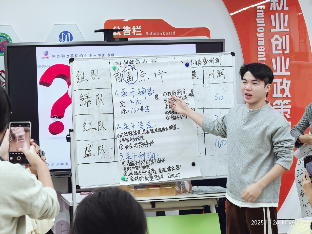 次日培训聚焦实战能力提升与成果梳理,SIYB实操沙盘课程通过模拟企业运营场景,让学员在角色扮演与决策模拟中,熟悉市场分析、成本控制、团队协作等企业经营关键环节,沉浸式体验让抽象的创业知识转化为可操作的实践能力;“分析并筛选出最好的企业想法”课程对前一天内容进行巩固拓展,帮助学员进一步完善创业构想;“你自己的企业想法”课程鼓励学员结合专业优势与兴趣方向,构建个性化创业方案;课程最后,“完成企业想法和行动计划”引导学员将零散思路整合为完整的方案框架,为后续创业实践提供清晰指引。