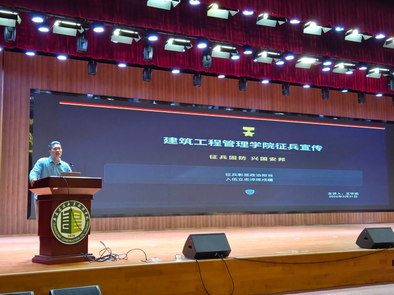 3月31日,建筑工程管理学院在学术报告厅举办2026年大学生征兵政策专题宣讲会。学院辅导员王华威担任主讲,2025级学生参加会议。