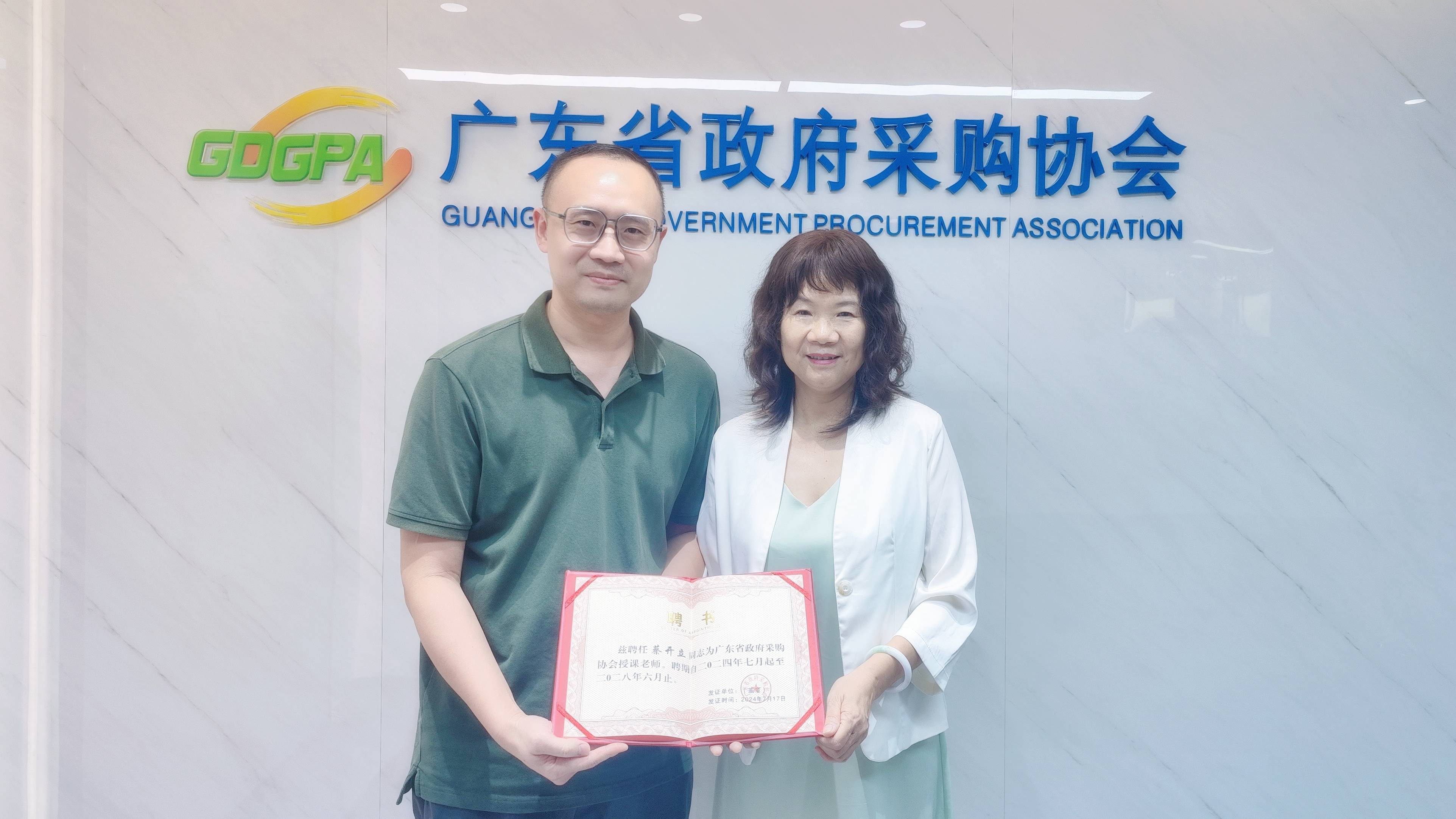 7月19日,我校招标采购办公室主任蔡开立受聘为广东省政府采购协会授课老师,聘期四年。广东省政府采购协会秘书长赵玉雯颁发授课聘书。