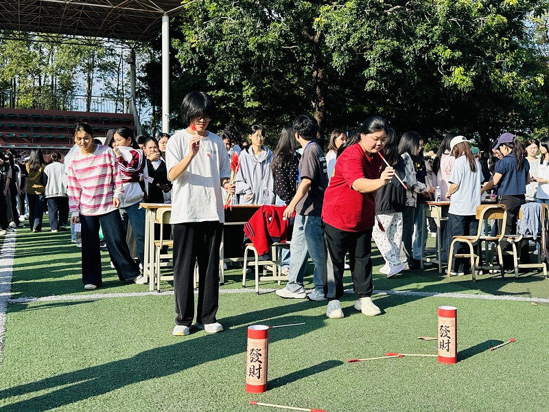 游园会设置七大主题打卡关卡,涵盖“投壶纳福”“智传呼啦圈”“毽步如飞”“海底捞月”“欢乐套圈圈”“运球大作战”等项目,形式多样,创意十足。特别设计的“宝藏线索”环节,通过寻宝兑换奖品,增强了活动趣味性与参与感。参与同学络绎不绝,热情参与。大家在轻松氛围中不仅体验到游戏乐趣,更在交流协作中提升了团队意识和集体凝聚力。
