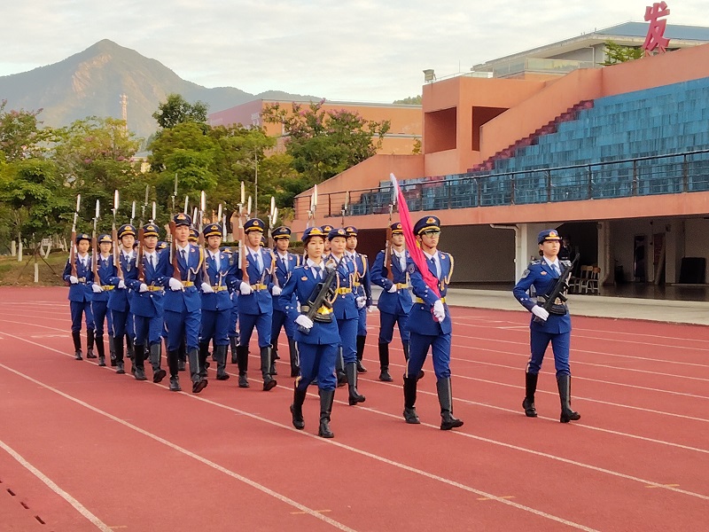 升旗仪式现场庄严肃穆。国旗护卫队队员迈着铿锵有力的步伐护送五星红旗进场。整齐的队列、挺拔的身姿,展现出新时代青年学子的昂扬风貌。伴随着雄壮的《义勇军进行曲》,五星红旗迎着朝阳冉冉升起,全体师生肃立行注目礼,心中涌动着对祖国的无限热爱与对法治的崇高敬意。