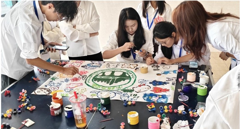 最为引人注目的环节是“共绘校园画布”。一幅巨幅画布铺展于场地中央,吸引众多同学携手参与。大家分工协作、默契配合,以色彩勾勒校园景致,以线条传递青春活力。整个创作过程不仅增进了同学情谊,也成为一站式学生社区中“师生共建、生生互动”的温暖缩影,构成了本次活动最动人的集体记忆。