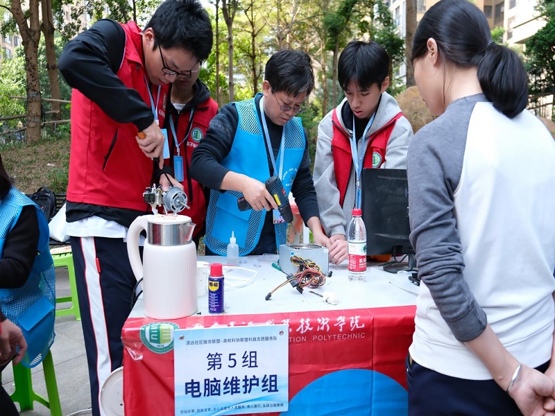 活动现场,我校师生驻守的家电维修区人气爆棚。居民们抱着故障的电风扇、电饭煲、微波炉、电脑等家电陆续而来,刘勇老师与社团成员迅速分工、默契协作,凭借过硬的专业知识和娴熟的实操技能逐一排查检修。在与其他院校志愿者的交流中,我校社团成员不仅学到了不同的维修技巧,更深刻体会到“众人拾柴火焰高”的协作精神。看到新科职校美发专业学子为老人修剪头发、岭南职院志愿者提供中医理疗服务时,社团成员感慨道:原来技能可以有这么多方式服务他人,这次实践让我明白“学以致用”的真正意义。刘勇表示,这样的活动促进了职教城学生社团共同体的成立,搭建了课堂知识与实际服务对接的桥梁,是“产教融合”的生动实践。