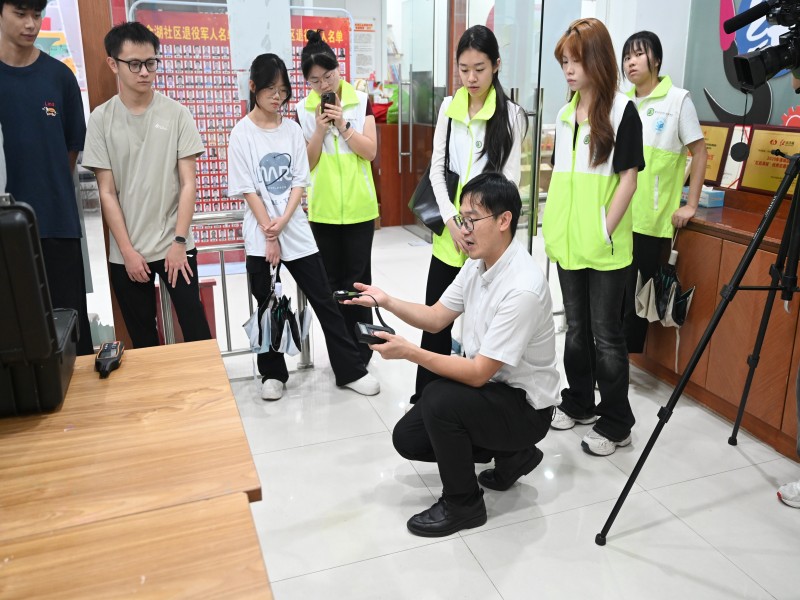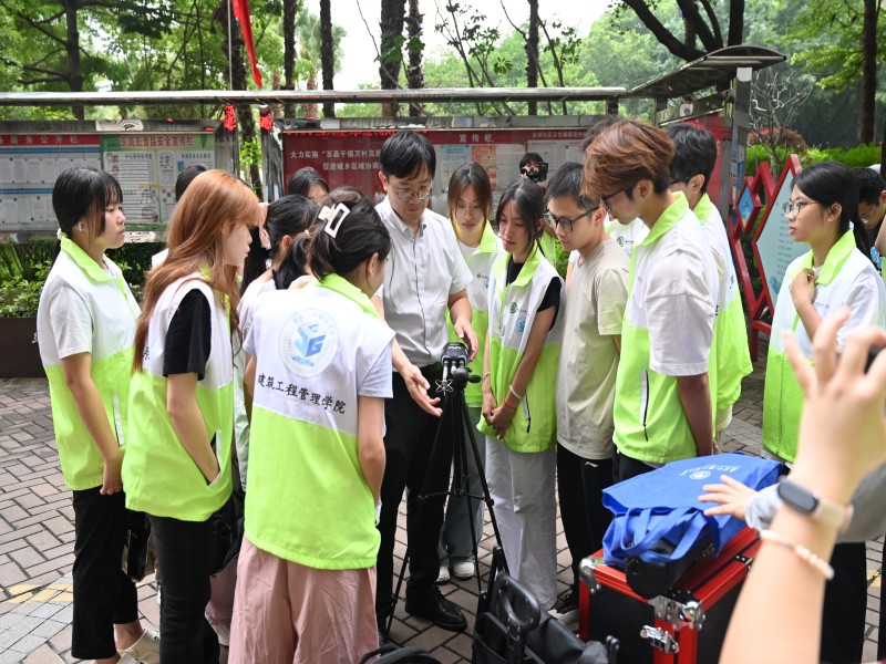 实践现场,张健健围绕建筑室内环境检测、空气质量监测等内容展开细致讲解,重点介绍了室内照度计、热舒适度仪、红外热成像仪、传热系数测试仪、甲醛检测仪等专业设备的工作原理、操作规范与数据判读方法。同学们分组协作,对社区公共空间、居民活动区域等公共建筑与住宅开展绿色建筑性能实测,完成仪器校准、现场采样、数据记录与初步分析,全程严谨认真、井然有序。